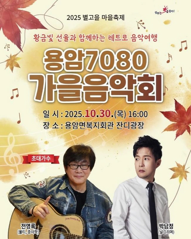 경상포커스=김경희기자성주군 용암면은 오는 30일 오후 4시 용암면 복지회관 잔디광장에서 '2025 별고을마을축제 용암7080 가을음악회'를 개최한다.