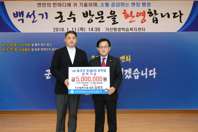 가산벌목산업은 지역인재육성과 교육발전을 위해 써달라며 (재)칠곡군호이장학회에 호이장학금 500만원을 기탁했다.고 14일 밝혔다