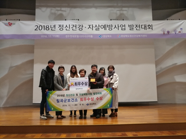 【경상포커스=배성호기자】칠곡군은 지난 11일 경주 현대호텔에서 개최한 경북도 2018년 정신건강사업 발전대회에서 최우수 기관으로 선정됐다.