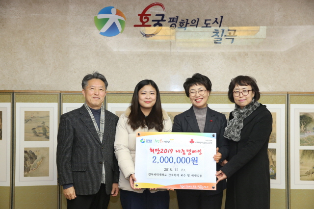 【경상포커스=배성호기자】경북과학대학교 간호학과 제경성 교무학생처장 및 강향숙 학생학과장, 문민지 학생대표가 지난 27일 칠곡군청을 방문해 어려운 이웃들을 위해 써달라며 이웃돕기 성금 200만원을 기탁했다.
